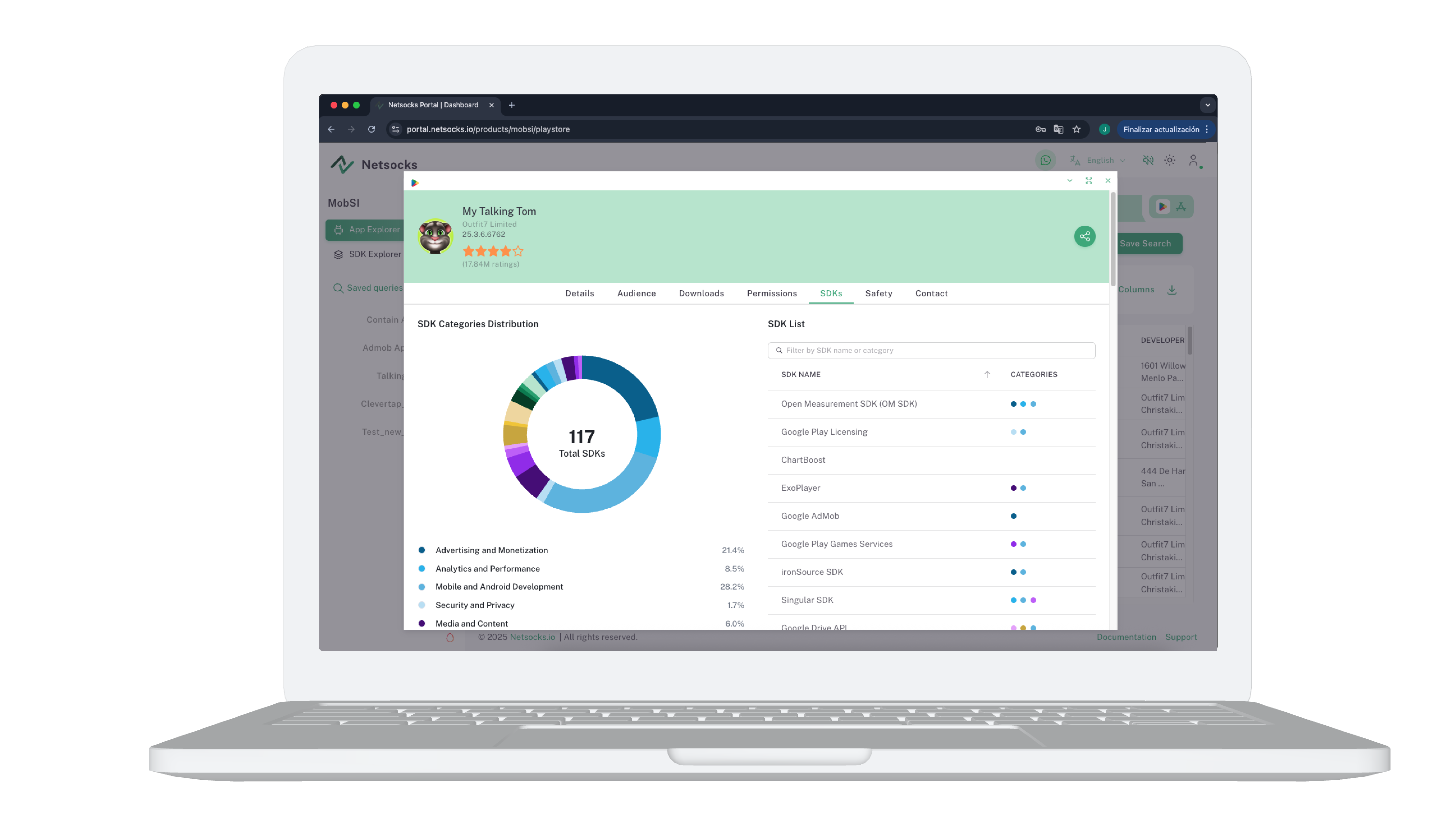 See the SDKs each app integrates such as monetization, analytics & performance, and security & compliance.