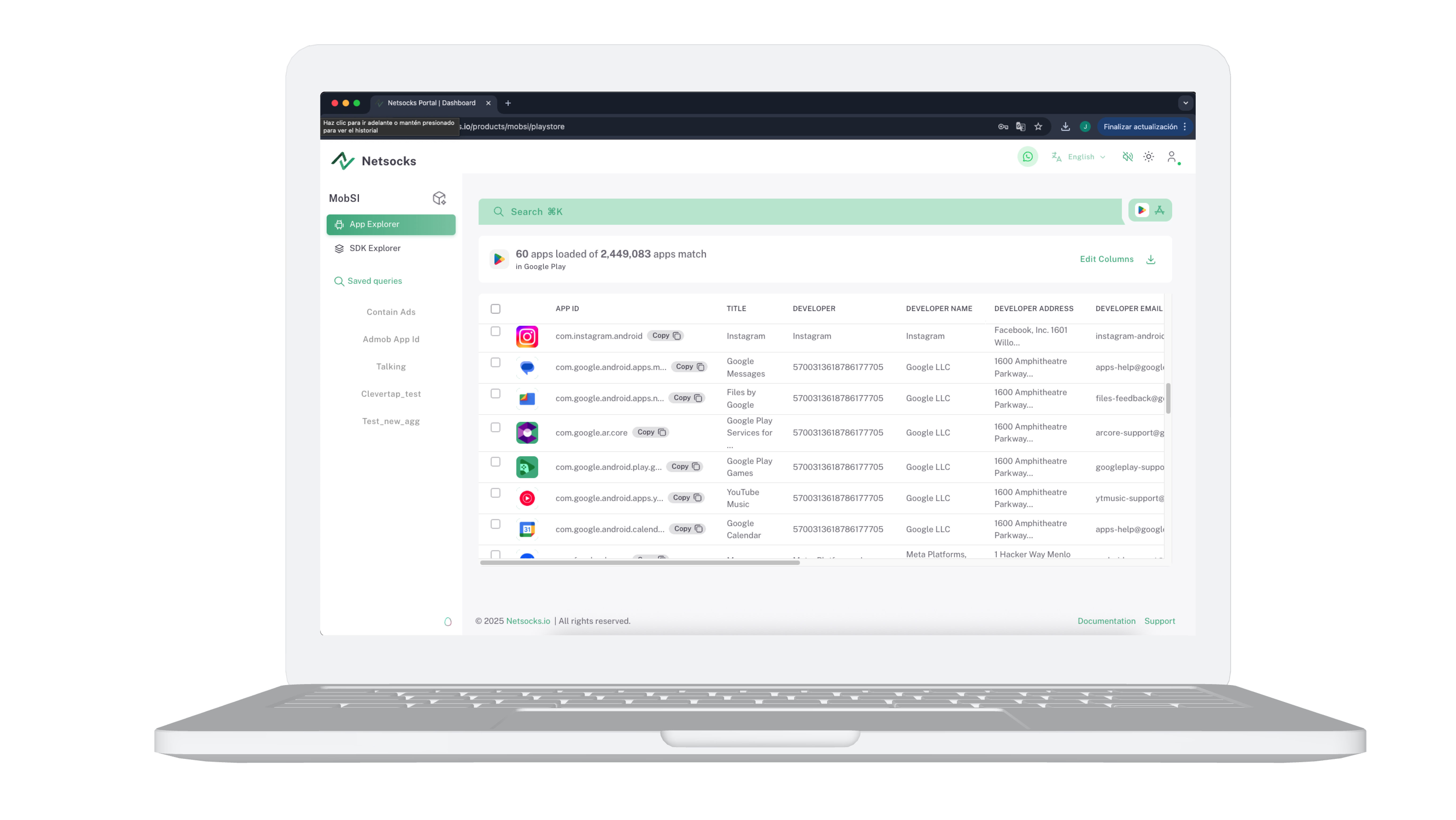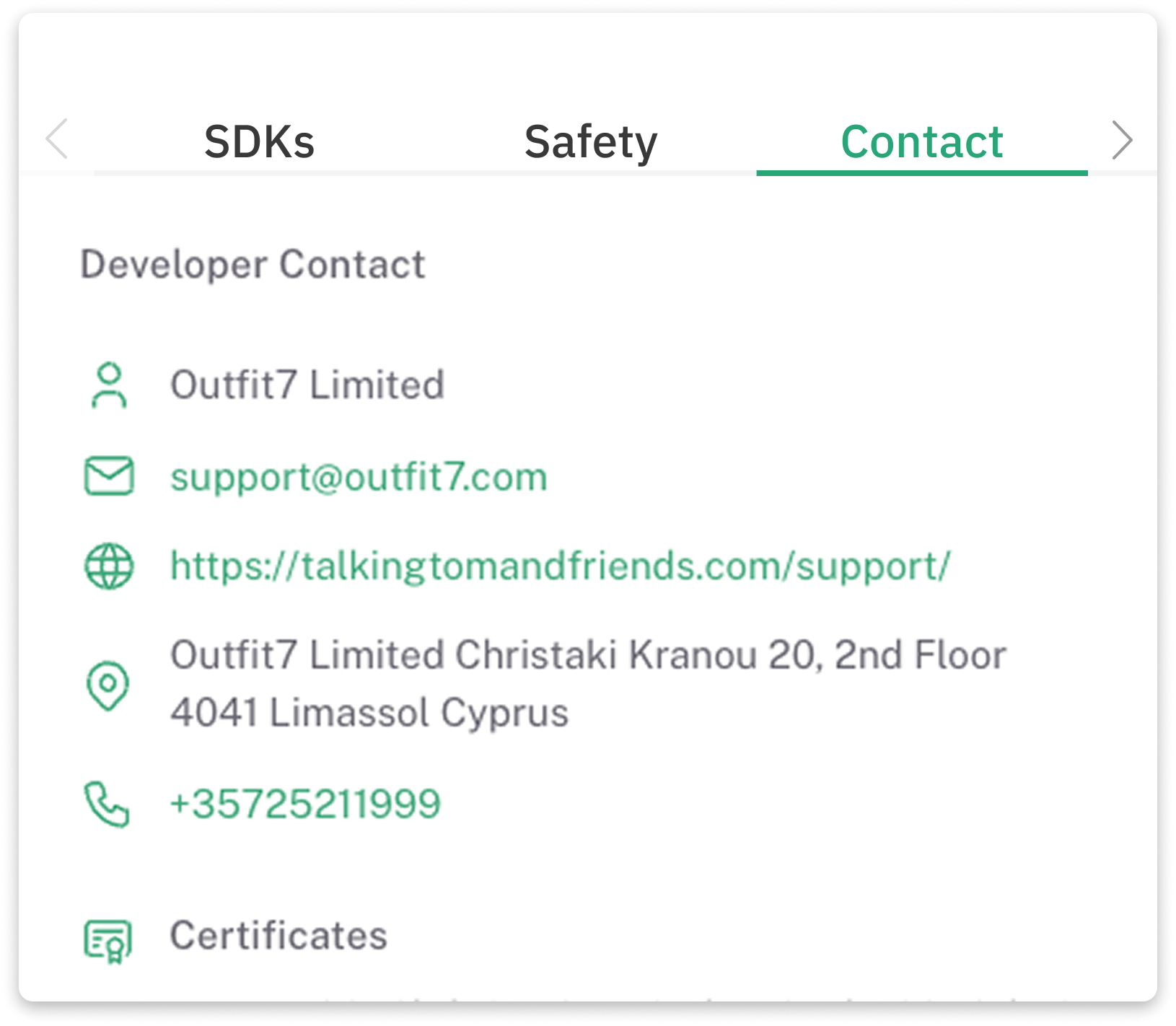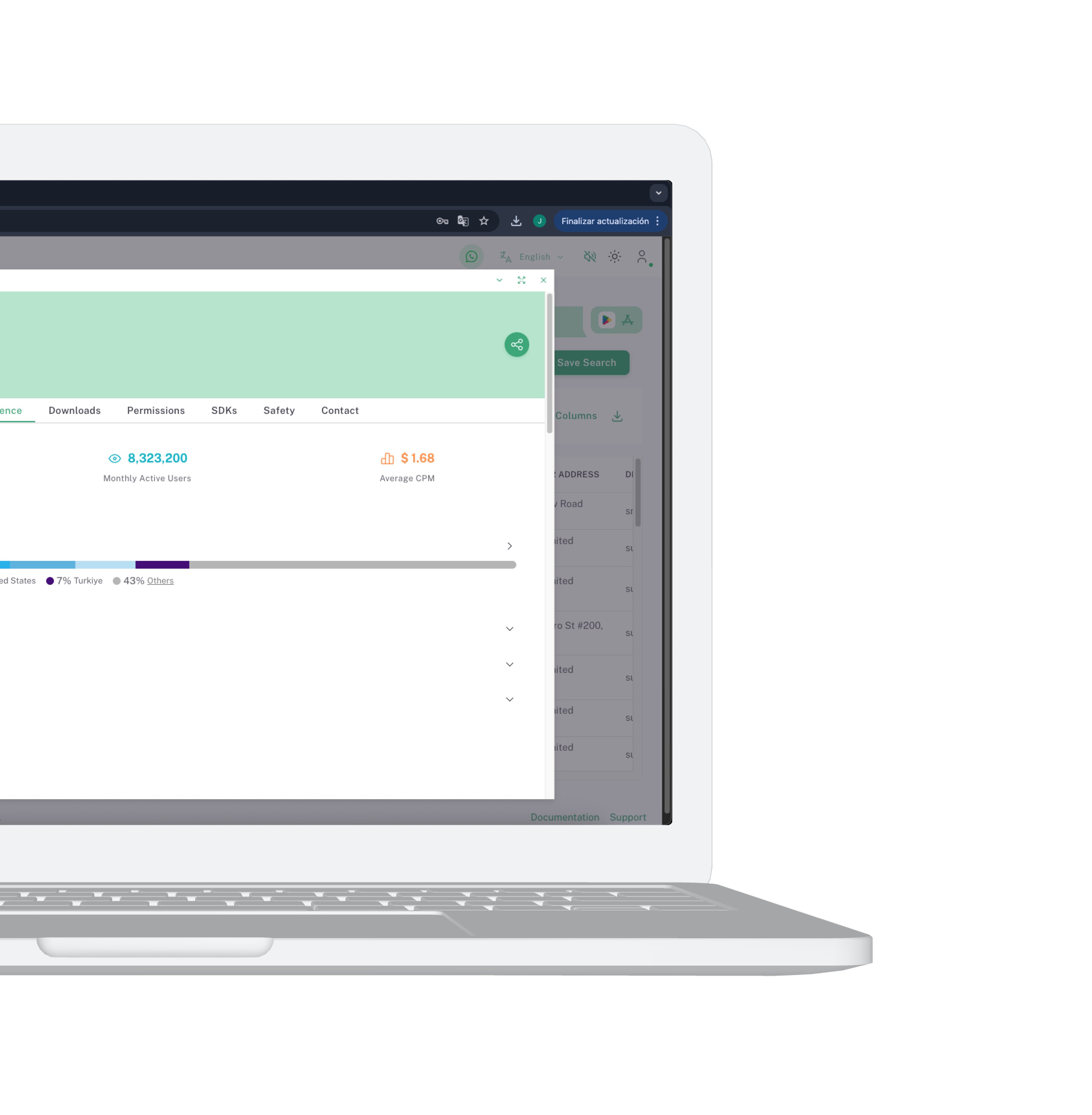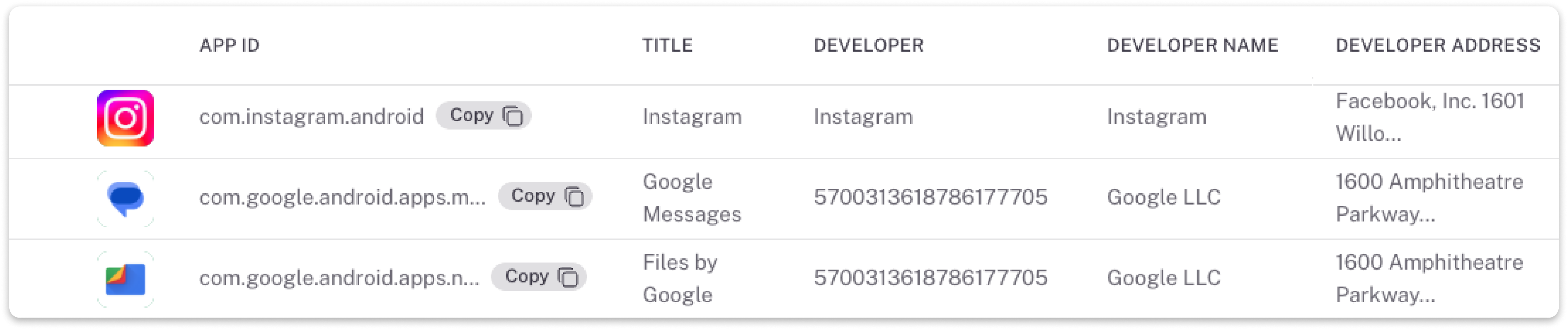 Get direct access to phone numbers, emails, websites, adress, and app IDs of developers making it easier to negotiate partnerships, accelerate monetization opportunities, and streamline integrations.